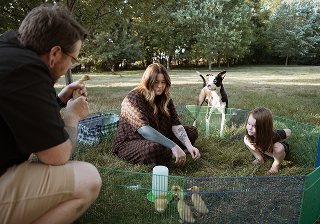 We have a dog, Darla, who is a big part of our family and one of the most gentle and loving pups. She is silly and loves to be around us wherever we are. This year we got 5 runner ducklings we named Betsy, Dot, Lulu, Peach, and Mabel. They’ve been very sweet pets and it’s been fun to watch them grow. We love having pets and raising our children around animals.
